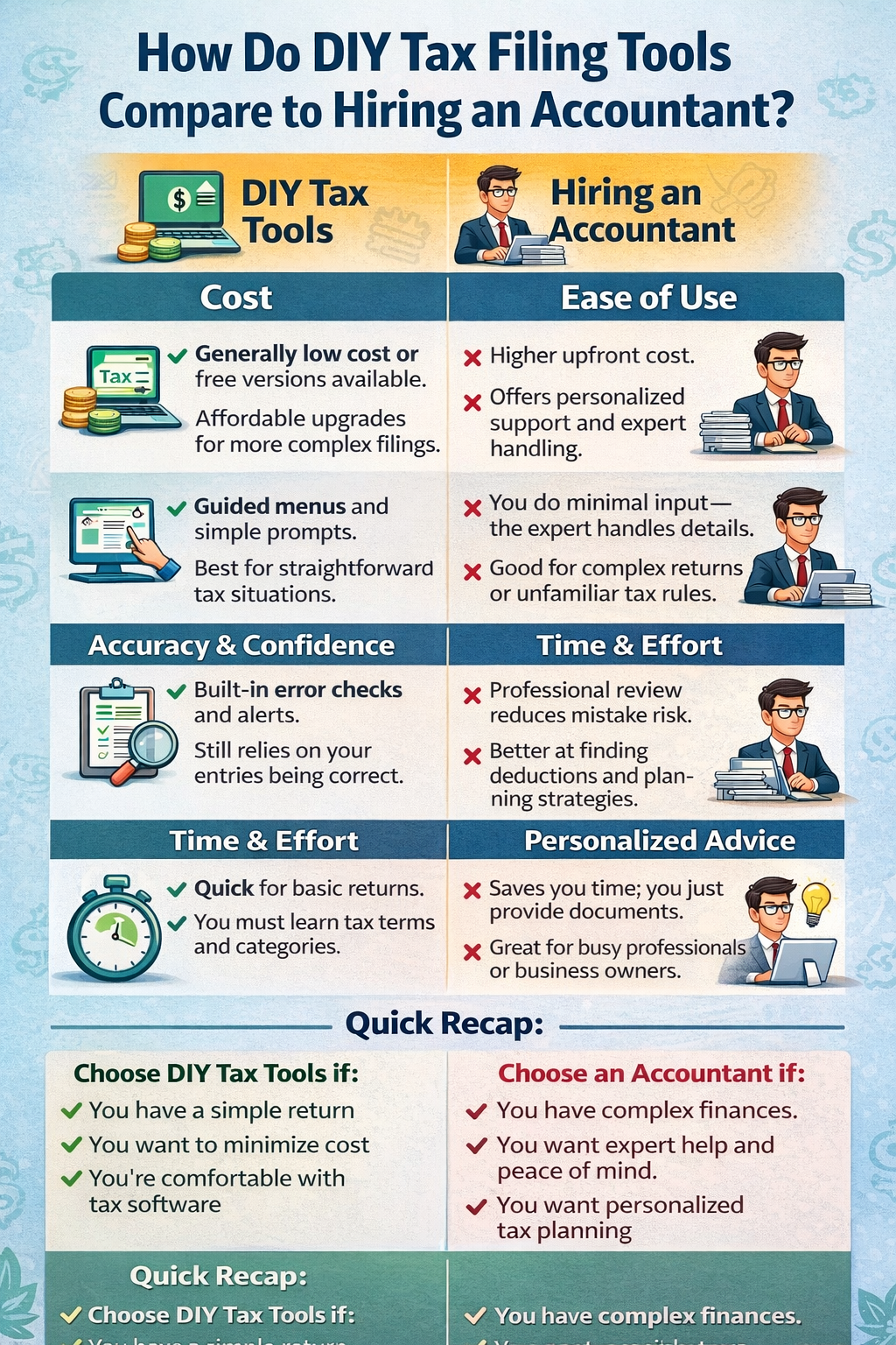 - DIY tools are quick for simple returns; accountants save time for complex ones.
